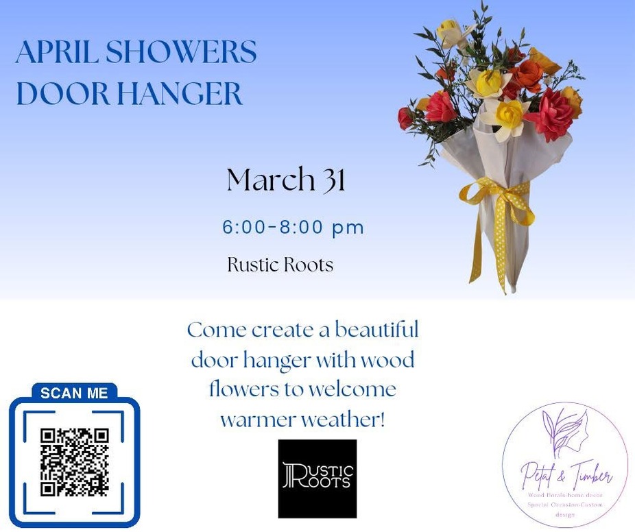 Join us for a fun April Showers Wood Flower Door Hanger workshop and craft your own spring decor! Drink ticket included. Sign up below